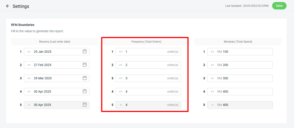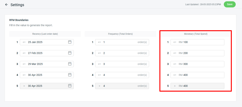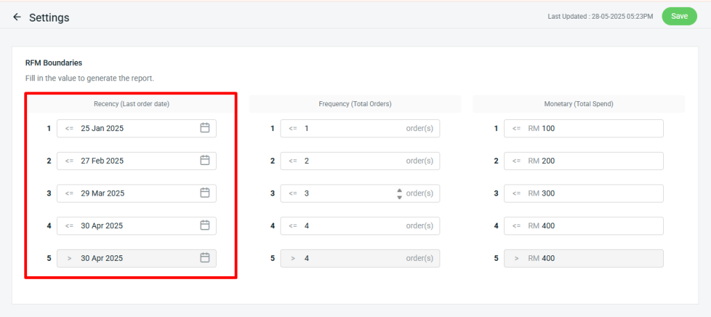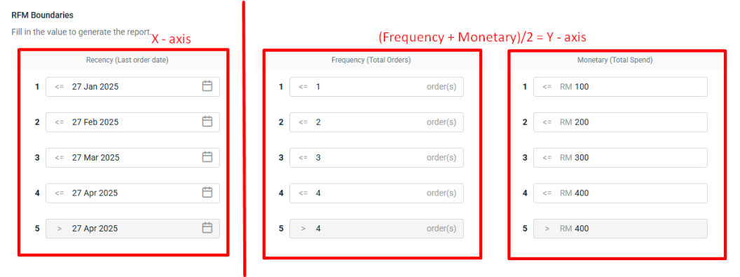 Step 3: Fill in the values for Recency, Frequency, and Monetary to generate the report. Each category will be segmented into 5 levels, from Level 1 (lowest) to Level 5 (highest).