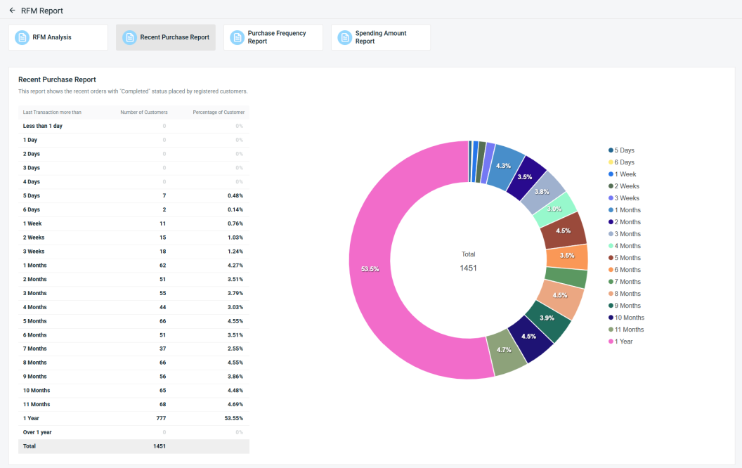 Step 1: The Recent Purchase Report displays the orders placed by recently registered customers. It provides a detailed breakdown of the time since each customer’s last transaction.
