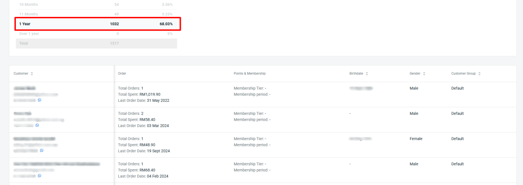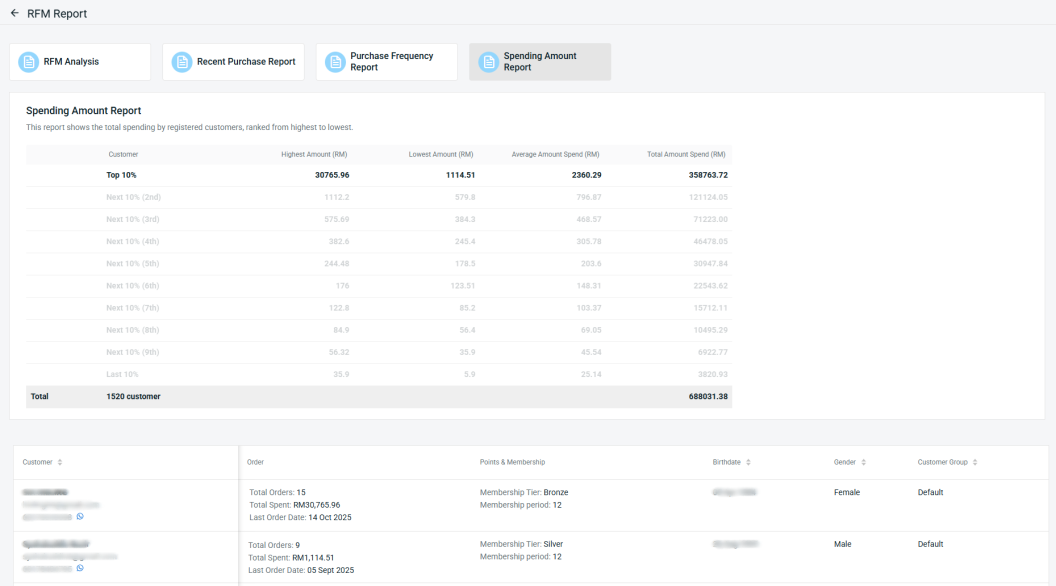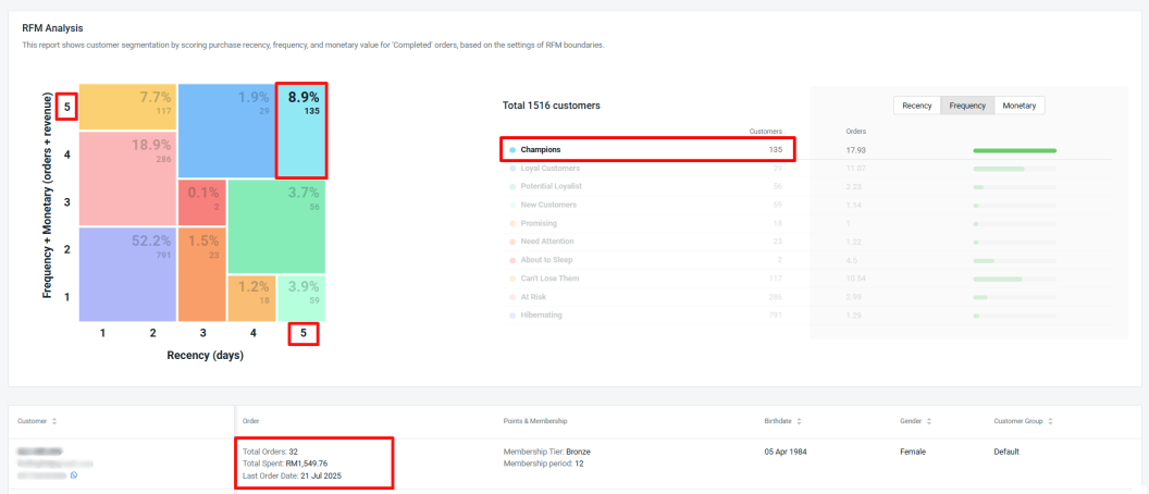Step 1: You may refer to the RFM Analysis Report, which automatically groups your customers into RFM Customer Segments based on key behaviors, Recency, Frequency, and Monetary Value, according to the scoring criteria you’ve defined in the settings.