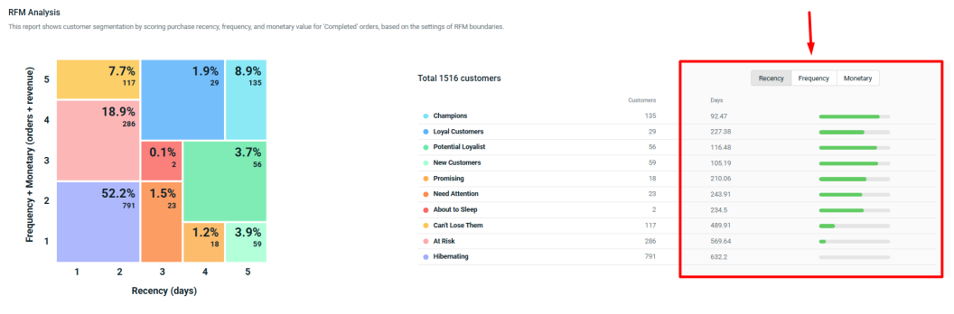 Step 2: From the right corner, you can also view the total Recency, Frequency, and Monetary scores based on the RFM Customer Segments criteria. This allows you to identify which customers to reward or follow up with to boost your website sales.