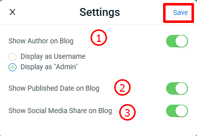 1. Show Author on Blog: You can choose whether to display the author’s username on the blog, or show it as ‘Admin’ instead. 2. Show Published Date on Blog: Readers will be able to see the date the blog post was published. 3. Show Social Media Share on Blog: The social media sharing button will appear on the blog post, allowing readers to easily share the content on their social media platforms.