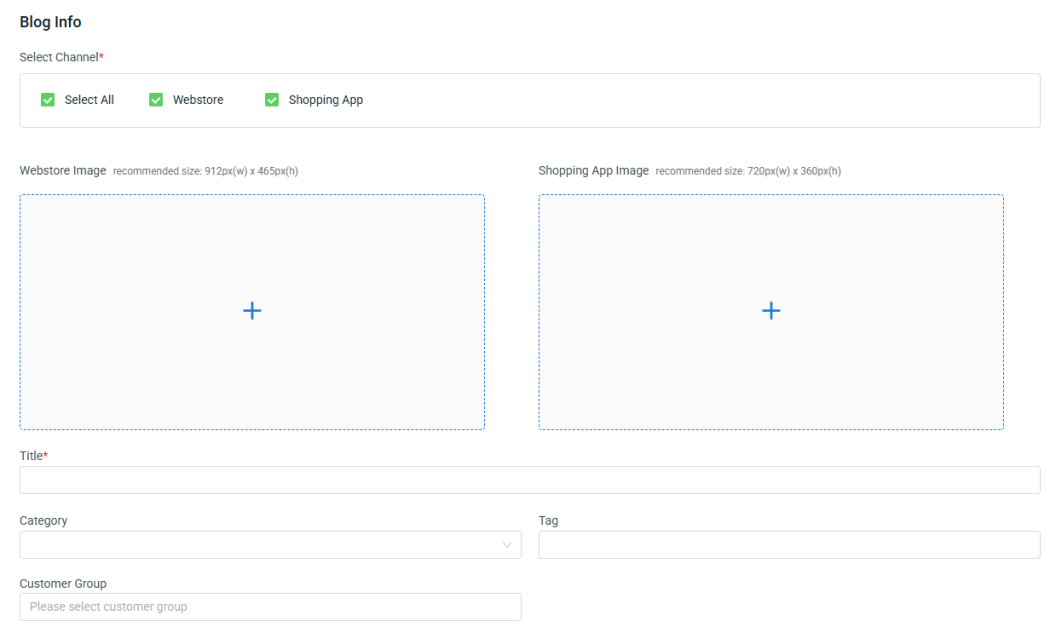 Step 2: Select Channel > upload the Image for the channel chosen as the cover image for your blog post > enter the blog Title > assign the blog Category > choose Tag and Customer Group (Optional).