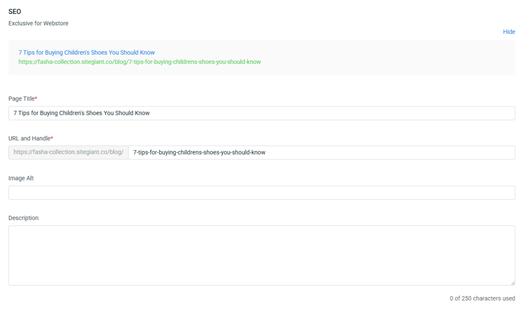 📌Note: SEO only needs to be filled in if you select the Webstore sales channel when updating the blog.