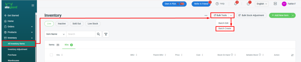 Step 1: Navigate to Inventory in the sidebar menu > All Inventory Items > click Bulk Tools > select Batch Create.