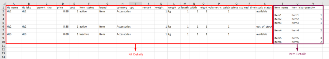 | quantity * | The quantity of the item that will be assigned under the Kit 📌Note: If only one item is assigned to the kit, please update the quantity to a minimum of 2. | 1 |