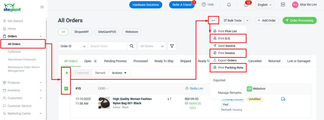 Step 1: Navigate to Orders > All Orders > select the order(s) > More(…) > choose to Print D.O./ Print Invoice/ Print Packing Note.