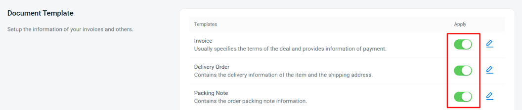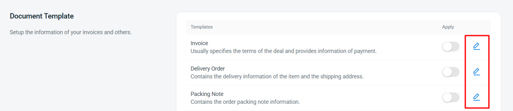 Step 2: Go to Document Template section > click Edit icon to customize the template.