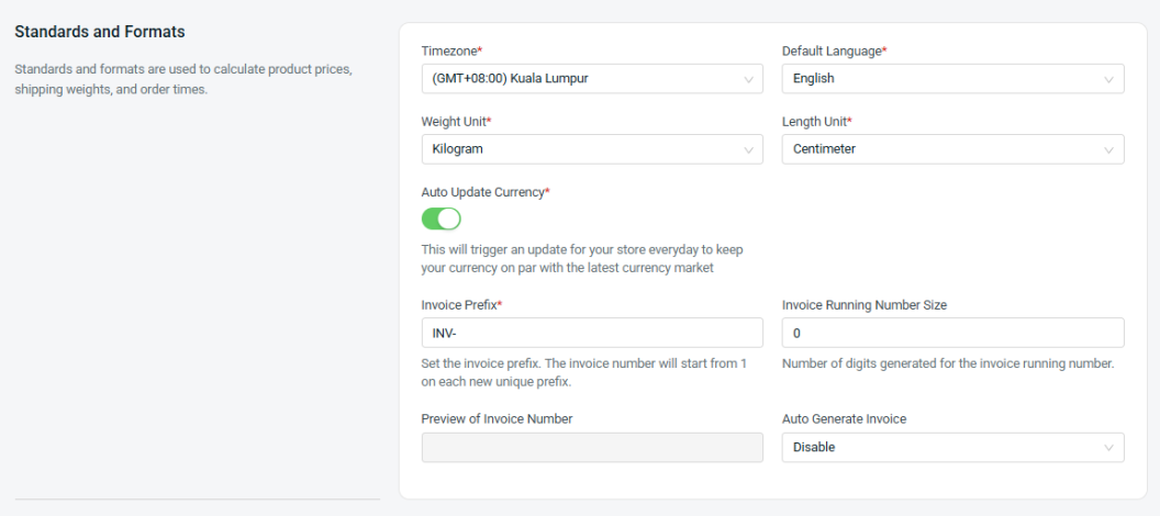 Step 5: You may set the timezone, weight unit, length unit, and invoice settings in the Standards and Formats section.