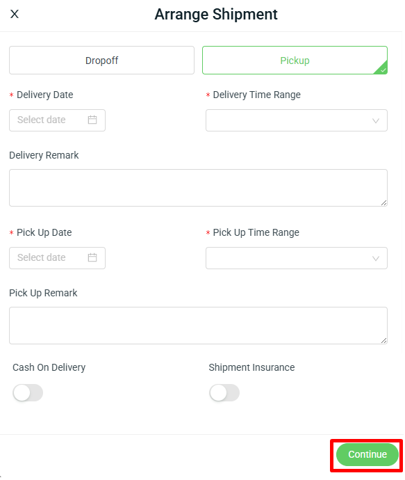 Step 5: Choose the preferred shipment options (Dropoff or Pickup) > fill in the required Arrange Shipment Information > Continue.