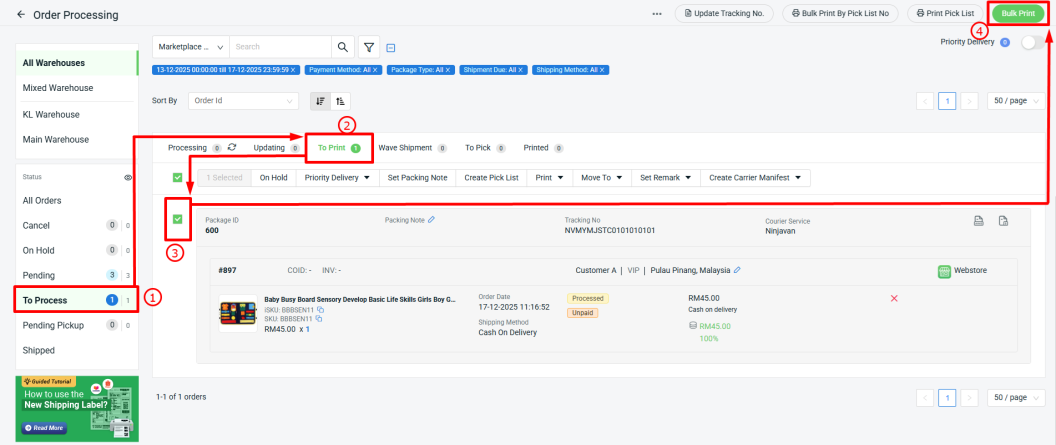 Step 1: Go to To Process section > To Print tab > select the order(s) > Bulk Print.