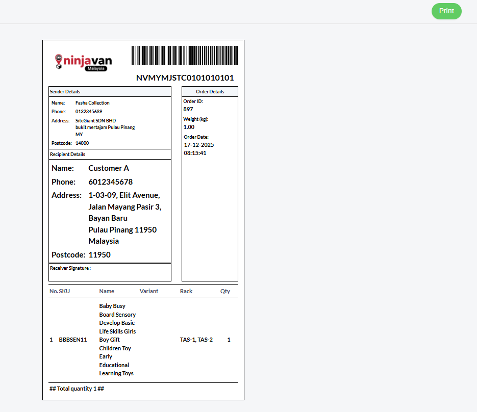 Ninjavan is a logistics and courier company that provides shipping and delivery services. Through SiteGiant, merchants can integrate Ninjavan for deliveries in Malaysia, Singapore, and the Philippines. This integration allows businesses to create shipments, print labels, and update tracking numbers directly within SiteGiant, making order processing faster and easier.