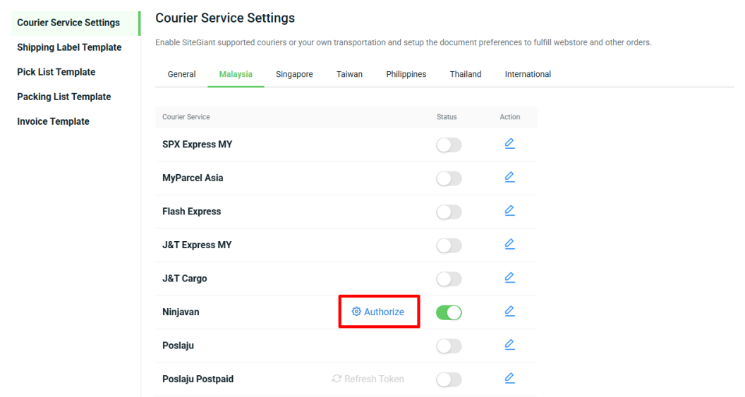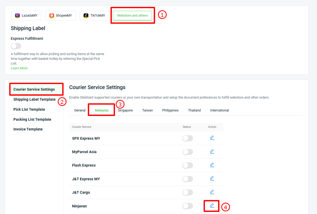Step 4: Select Webstore and others tab > Courier Service Settings > Malaysia > click on Edit icon of Ninjavan.