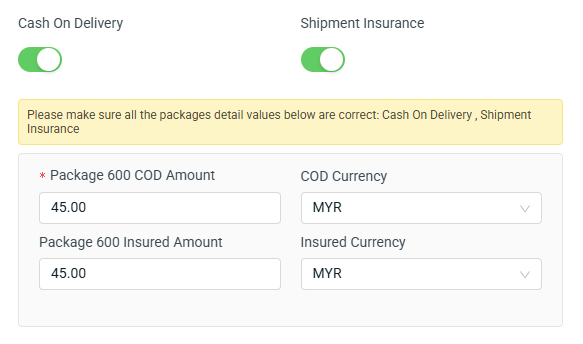 📌Note: If Cash On Delivery and Shipment Insurance are enabled in the Shipping Label settings, the options will appear under this Arrange Shipment Information. Enabling these options requires you to enter the COD amount and the Insured Amount. The Insured Amount is considered an additional charge for shipment insurance.