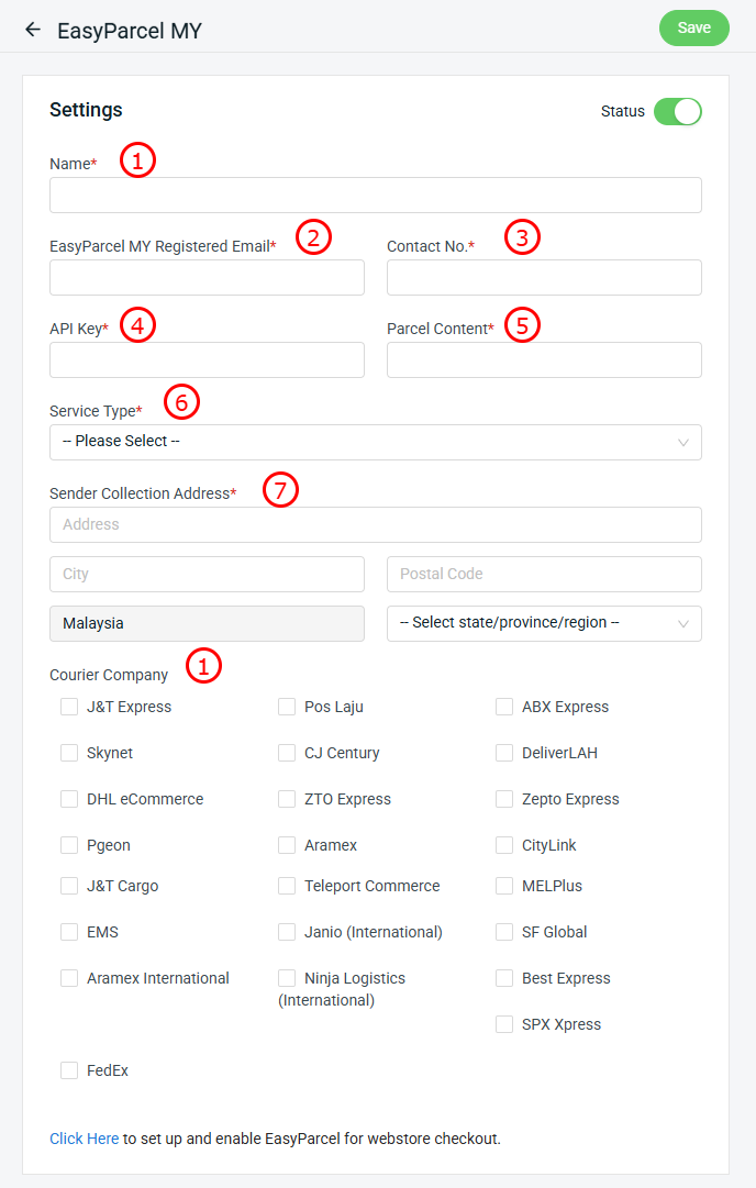 Step 2: Enable the Status > fill up the details for EasyParcel Settings