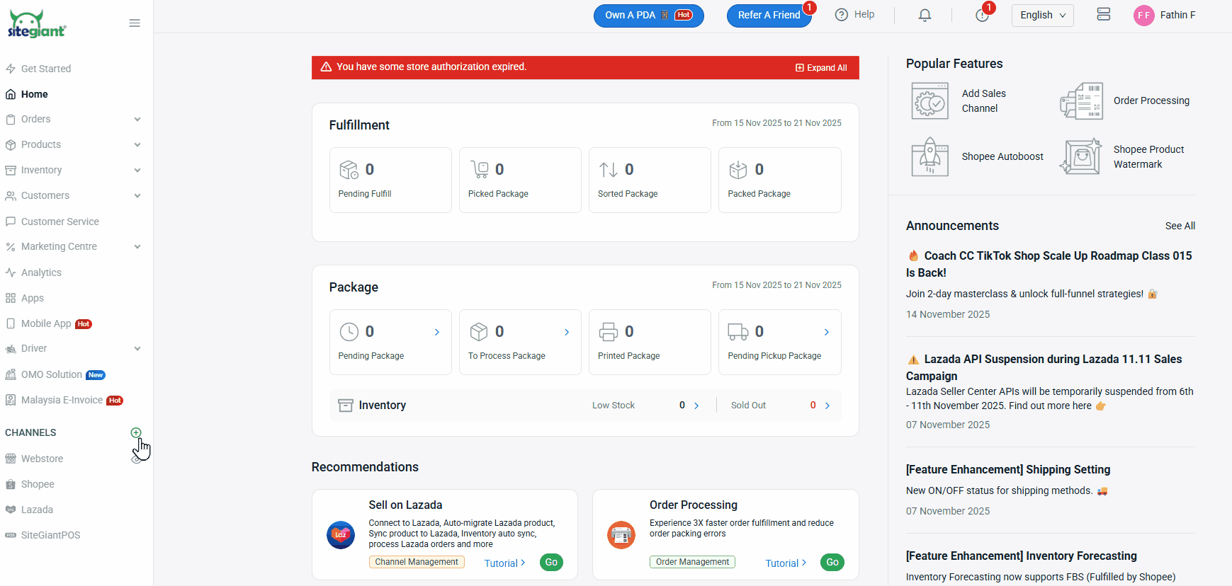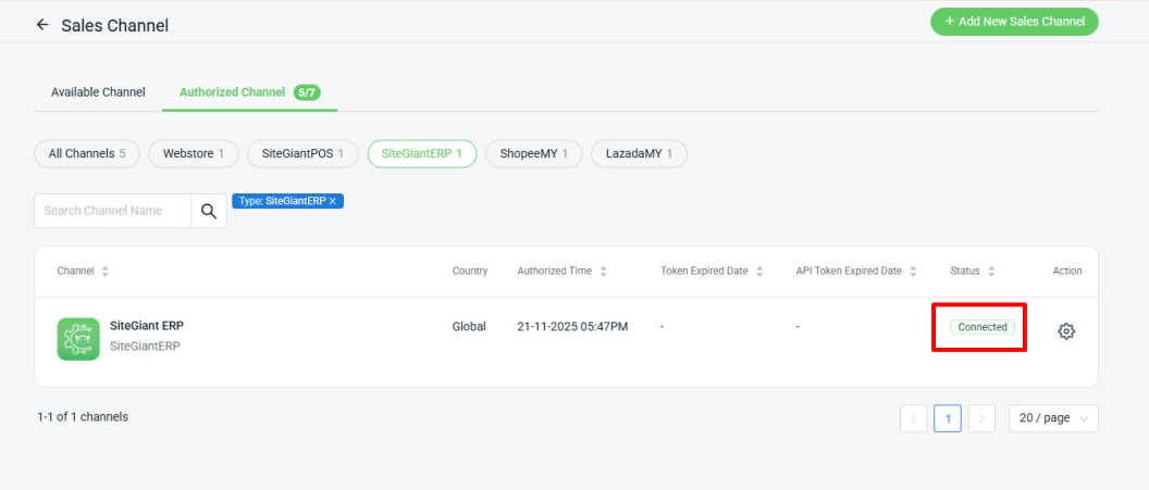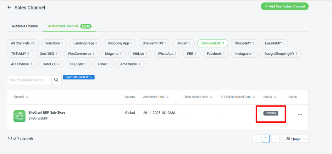 Step 1: Back to the sub-store SiteGiant ERP account > add [+] channels > click Authorized Channel.