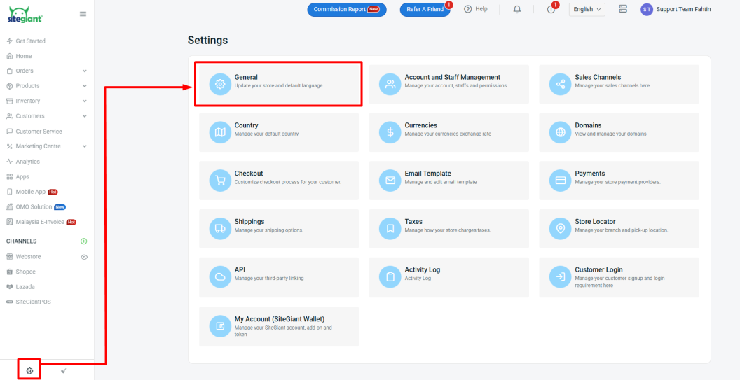 Step 1: Log in to the sub-store SiteGiant ERP account > navigate to Settings on the sidebar > click General.