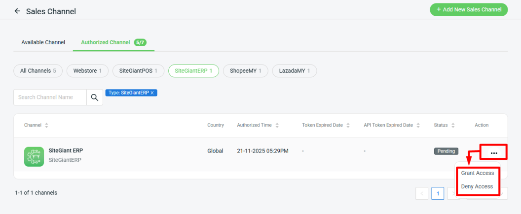 Step 2: Select the SiteGiant ERP channel > click More (…) > click Grant Access to accept the integration, or Deny Access to decline it.