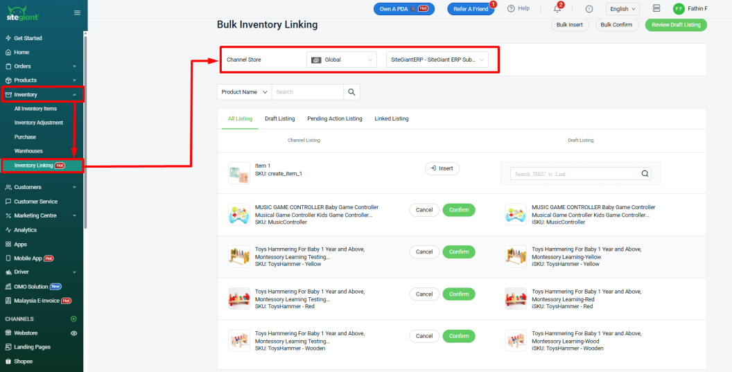 Step 1: Navigate to Inventory on the sidebar menu > Inventory Linking > select Global Channel Store > SiteGiant ERP.