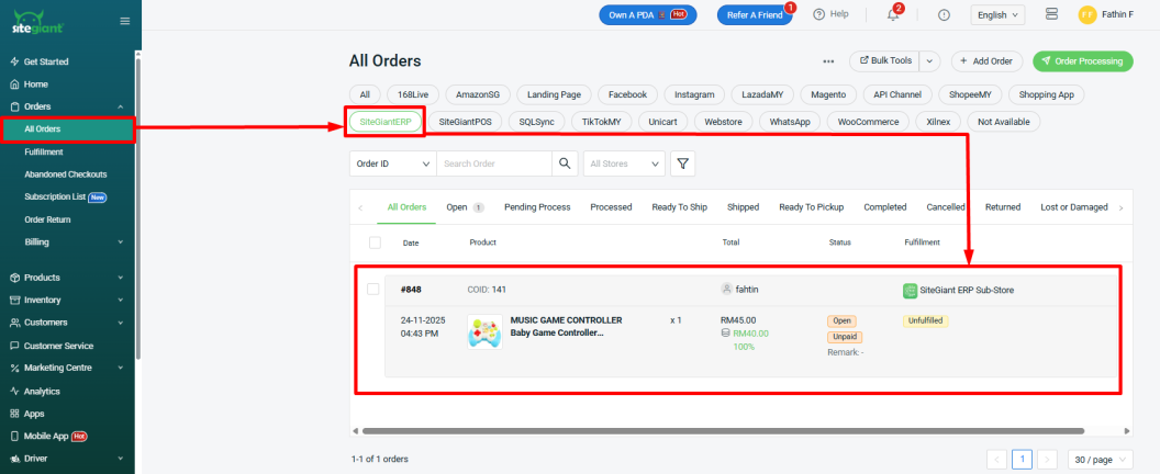 Step 1: Orders will sync from the sub-store to the main store. You can view them under Orders > All Orders > SiteGiant ERP orders.