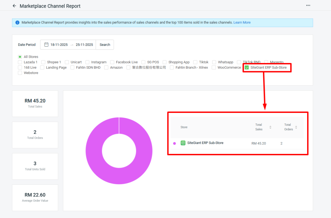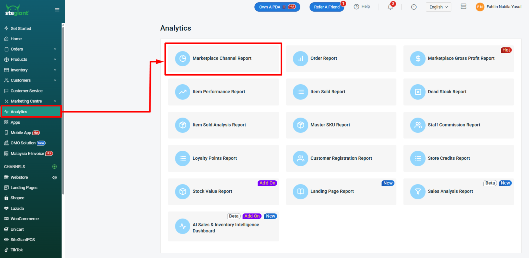 Step 1: SiteGiant ERP analytics can be viewed just like other sales channels. For example, you can check it under Analytics > Marketplace Channel Report.