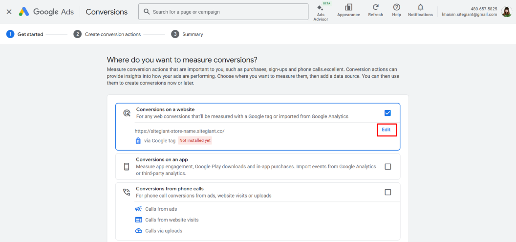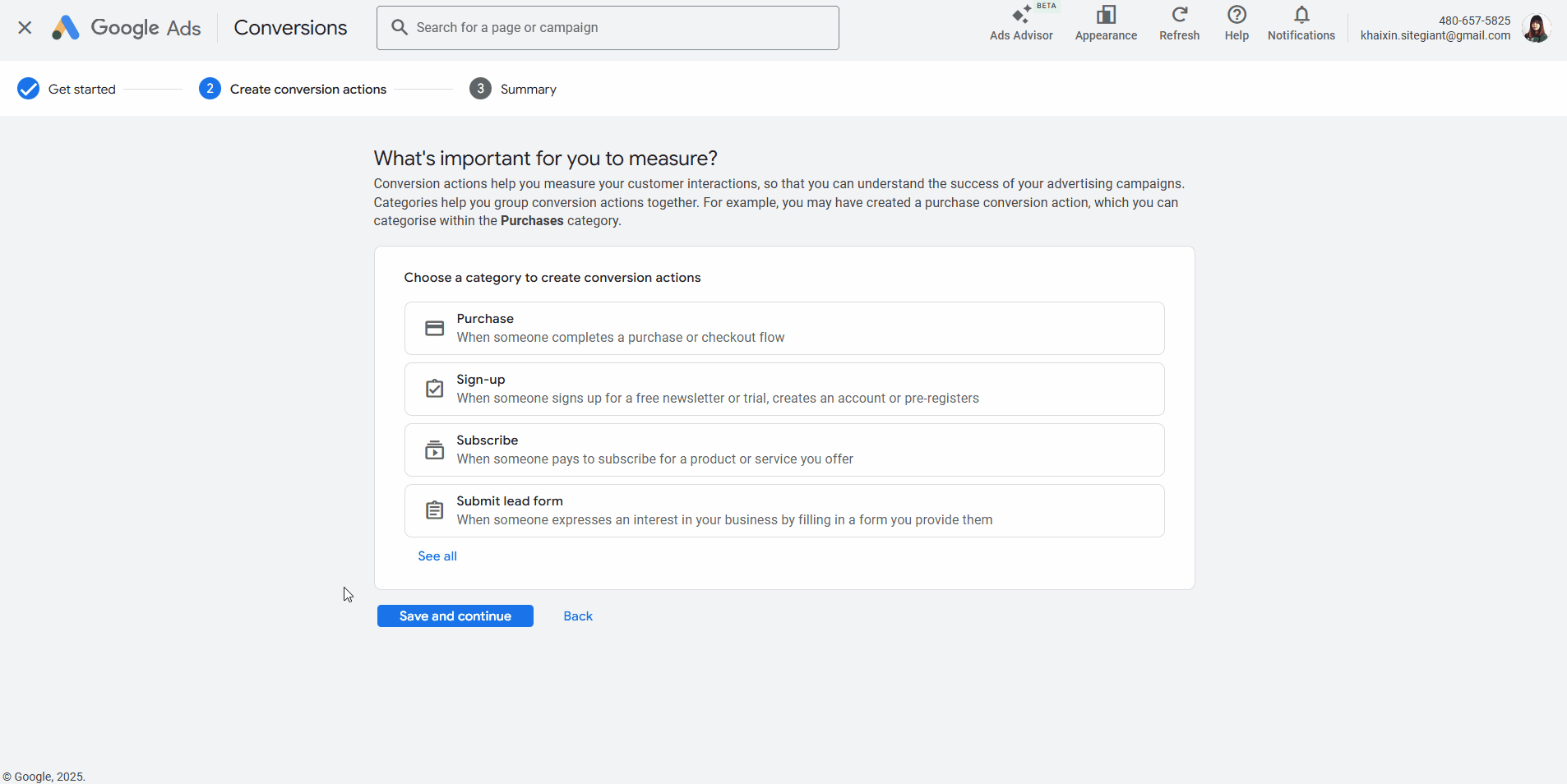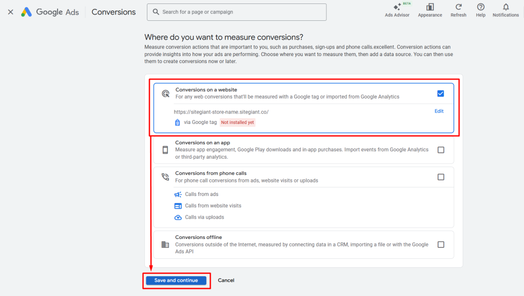 Step 7: Make sure Conversions on a website is selected > Save and continue.