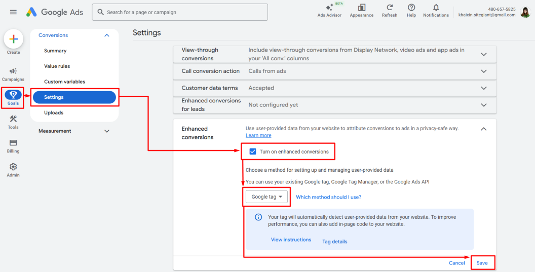 Step 2: Navigate to Goals > Settings > Enhanced conversions > tick Turn on enhanced conversions > choose Google tag > Save.