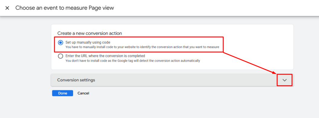 Step 9: Choose Set up manually using code > click the drop down icon of Conversion settings.