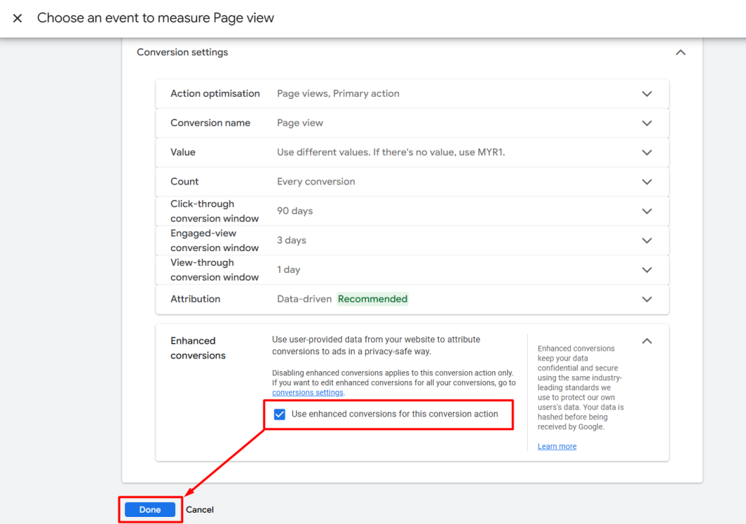 Step 10: Scroll down to Enhanced conversions section > tick Use enhanced conversions for this conversion action > Done.