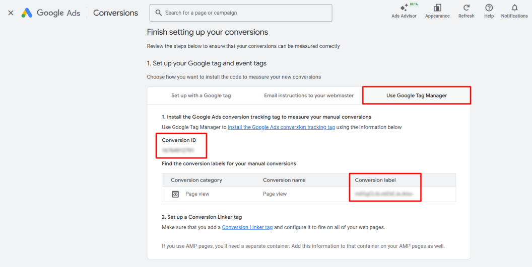 Step 11: Choose Use Google Tag Manager > copy the Conversion ID and Conversion label for later use.