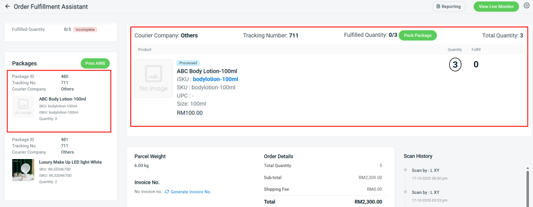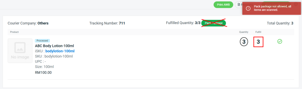 📌Note: Once all items are fully scanned in a package, pack package is no longer allowed.