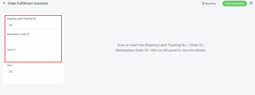Step 2: Scan or insert the Shipping Label Tracking Number/ Marketplace Order ID/ Order ID.