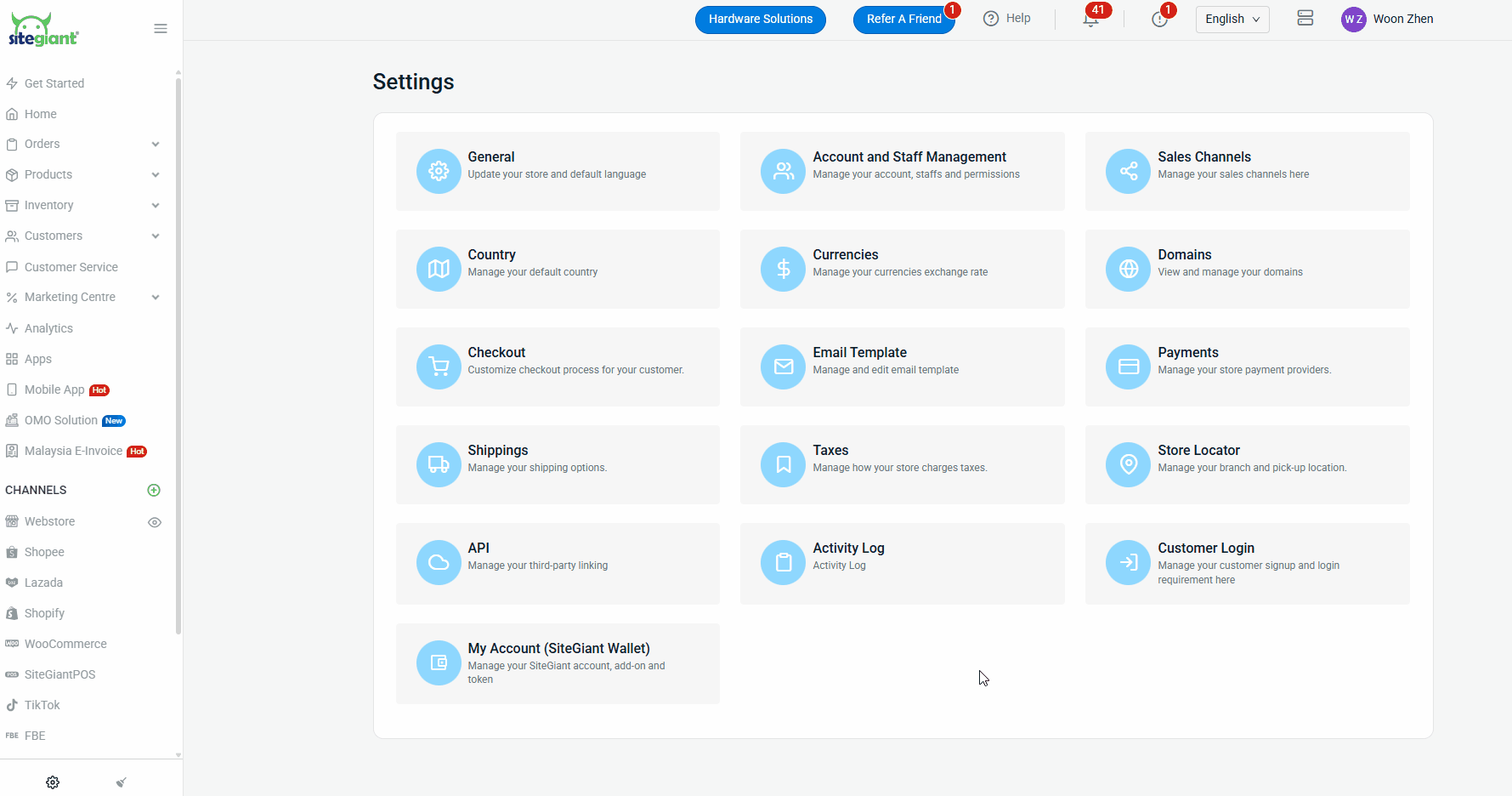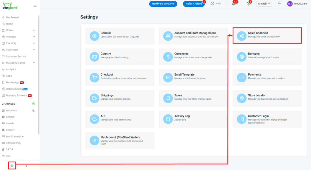 Step 1: Navigate to Settings at the sidebar menu > Sales Channels.