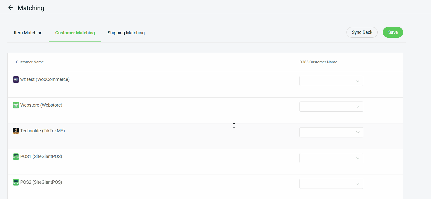 Step 1: Under Customer Matching, select the relevant D365 Customer Name to match as the order customer for each sales channel in SiteGiant.