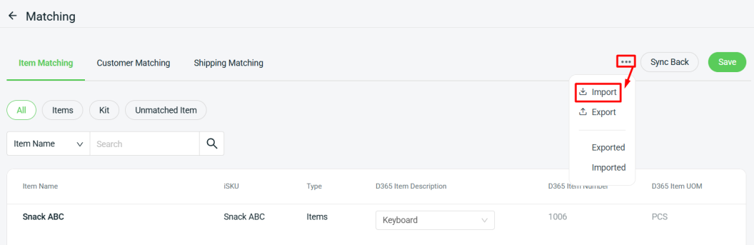 Step 5: Go back to the Item Matching tab > click … > Import.