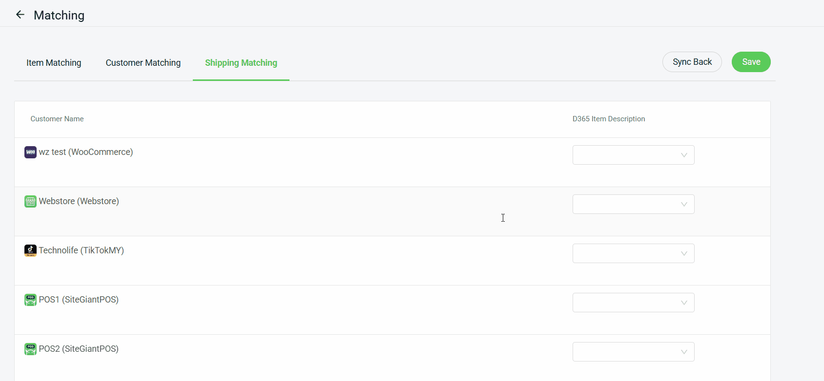 Step 1: Under Shipping Matching, select the relevant D365 Item Description to match as the order shipping fee for each sales channel in SiteGiant.