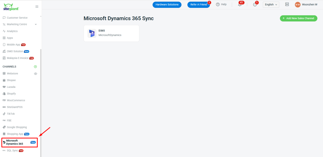 Step 3: If connected successfully, then a Microsoft Dynamics 365 channel will appear in the sidebar menu.