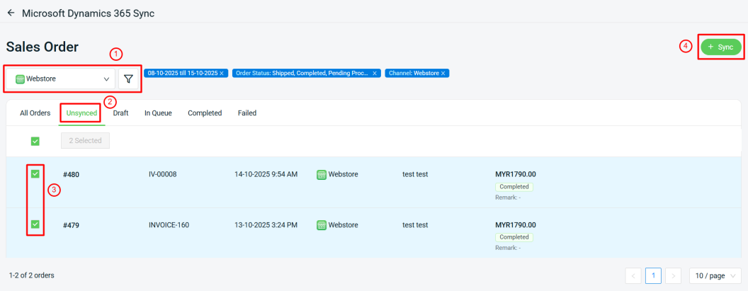 Step 3: Filter out the order that you want to sync > under the Unsynced tab > select the relevant orders > click + Sync.