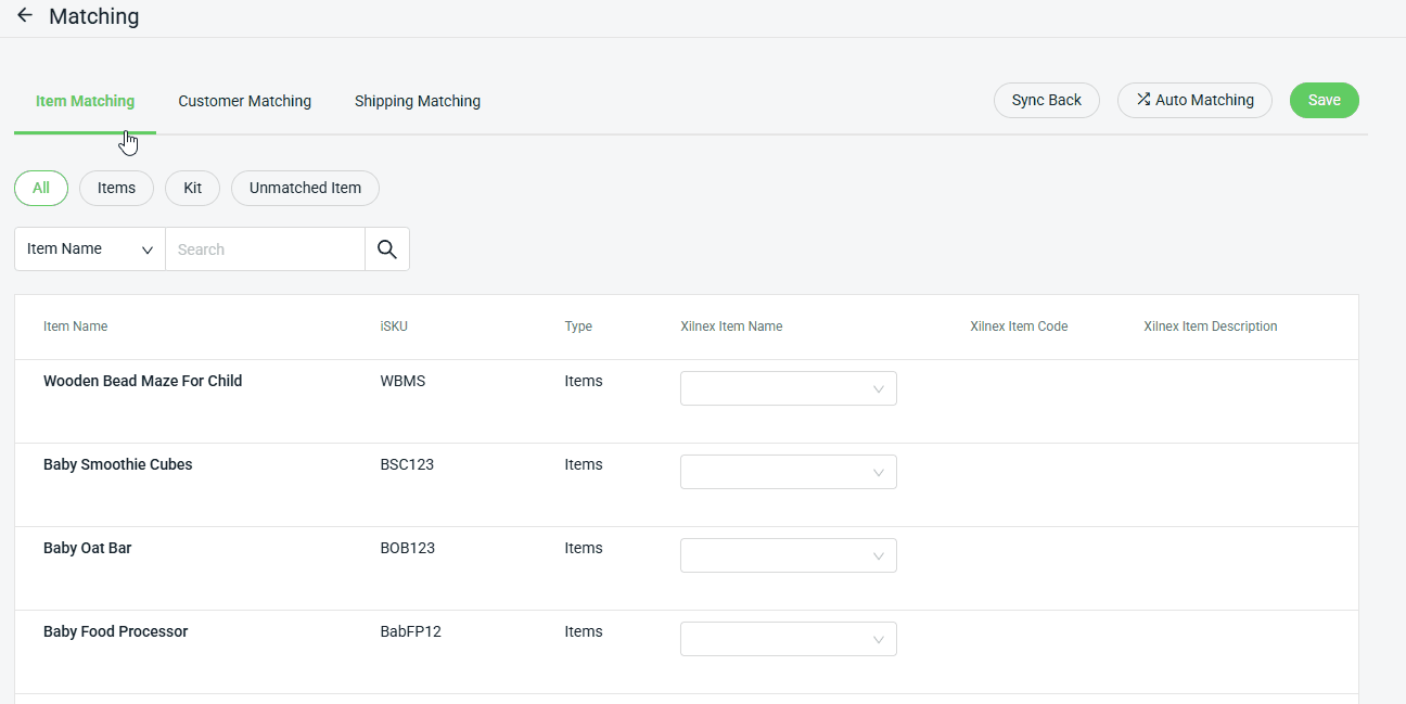 Step 1: Under Product Matching, all your Inventory Items will be listed > select the relevant product from Xilnex to match with the Inventory Item in SiteGiant > Save.