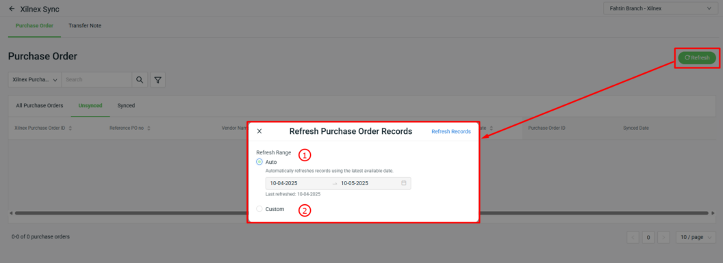 1. Auto: The start date will always refer to the Last Refreshed Date, and the end date will automatically be set to a date up to one month. The Last Refreshed Dat is updated to today’s date only when records are refreshed using the auto option.