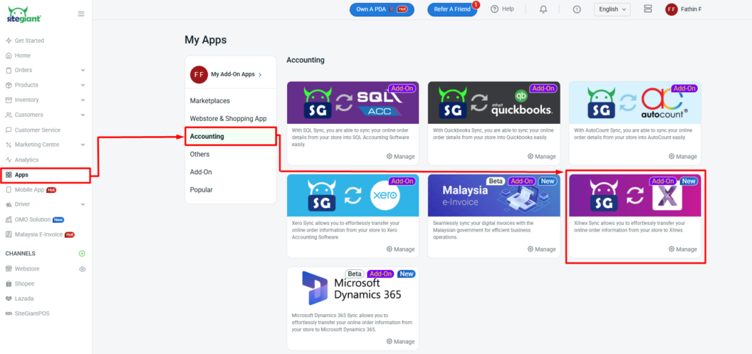 Step 1: Navigate to Apps on the sidebar menu > Accounting > click Xilnex.