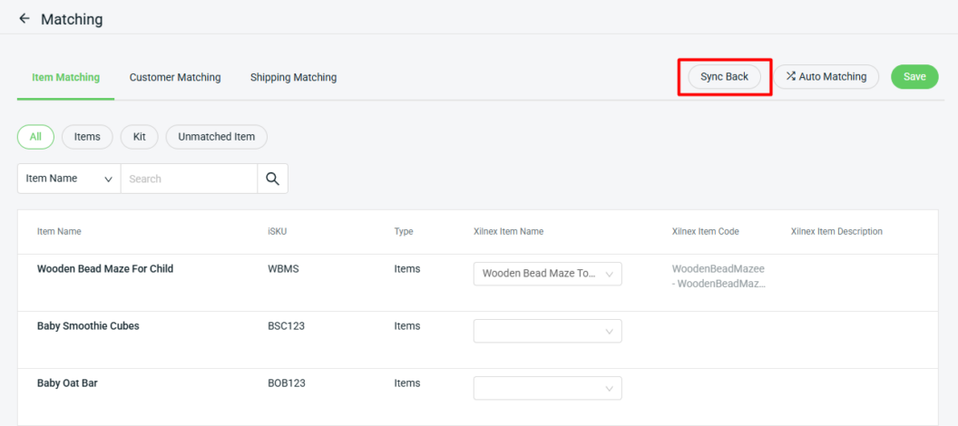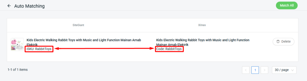 Step 2: If the Product Code in Xilnex matches the iSKU from SiteGiant, the system will automatically match the product for you.