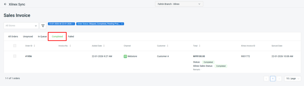 Step 4: Once the order has been successfully synced to Xilnex, it will automatically be moved to the Completed tab.