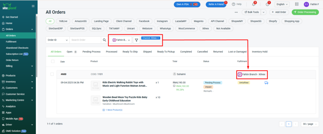 Step 3: All Sales Invoice Listings created in Xilnex will automatically sync to the SiteGiant order listing under Xilnex.
