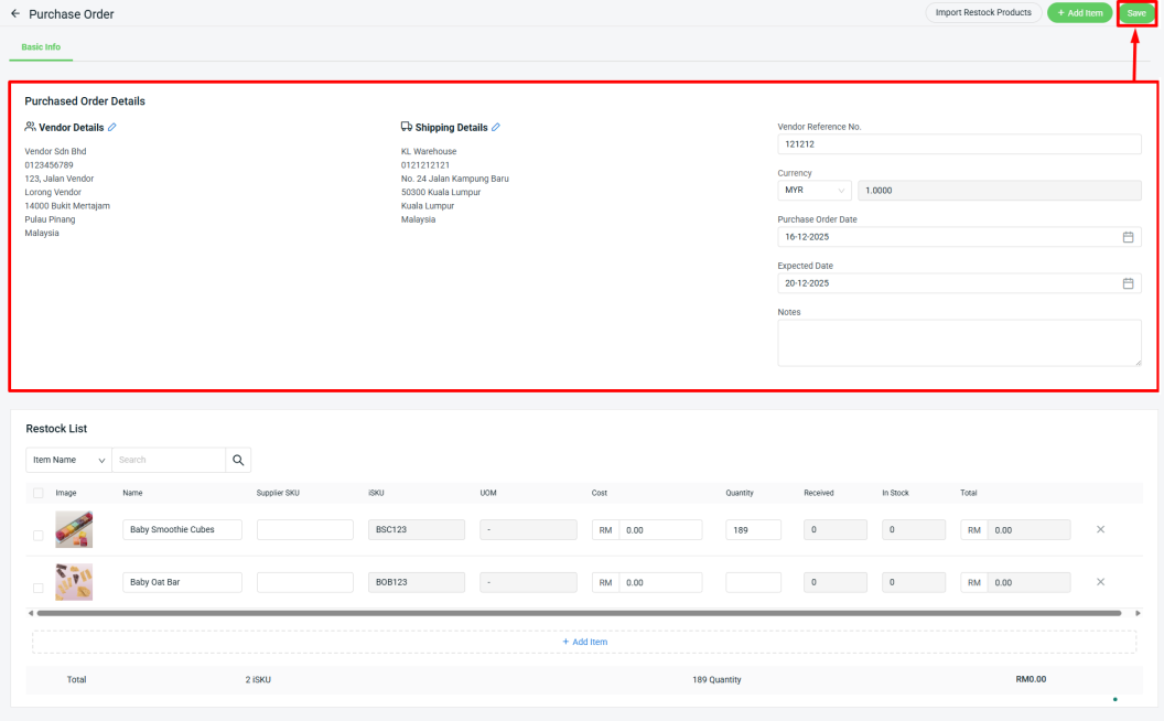 Step 2: Fill in the Purchase Order Details > click Save.