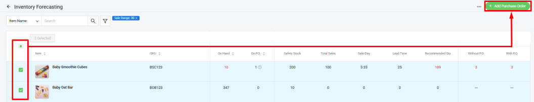 Step 1: Tick Item > click + Add Purchase Order.