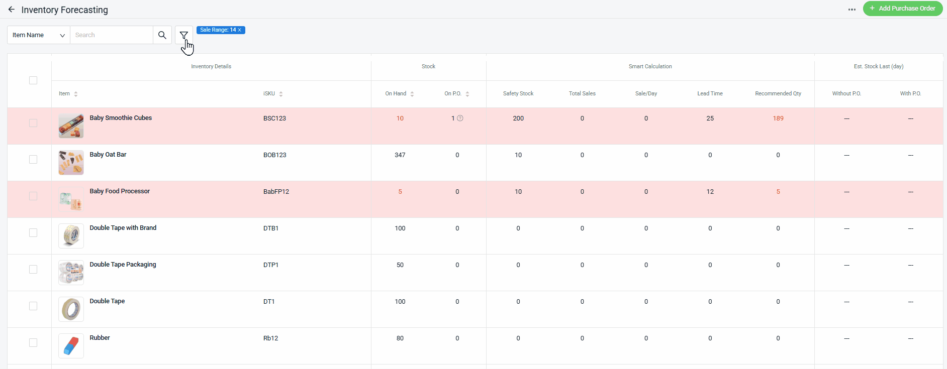 There are three ways to calculate the Recommended Quantity, and the system will use the highest value. The example calculation below will be based on the image above: 1. Based On Safety Stock Total Stock (On Hand)+ On P.O: 11 Safety Stock: 200 Recommended Quantity: 200 - 11 = 189 Stock 2. Based On Sales Per Day Total Stock (On Hand)+ On P.O: 11 Sales/day: 3.33 Lead Time: 25 Recommended Quantity: (3.33 x 25) - 11 = 72.25 ~ 72 Stock 3. Based On Sales Factor - Sales Factor will only apply when the inventory forecast is filtered based on Sales Factor.Total Stock (On Hand)+ On P.O: 11 Total Sales: 100 Sales Factor: 100% Recommended Quantity: (100 x 100%) - 11 = 89 Stock According to the the results above, the Recommended Quantity is taken from the Safety Stock calculation, as it provides the highest value of 189 stock.