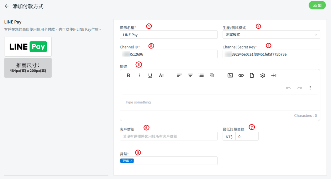 步驟三:填寫 LINE Pay 的詳細信息,如顯示名稱生產/測試模式Channel ID、Channel Secret Key、描述客戶群組最低訂單金額貨幣