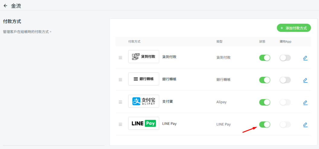 步驟五:完成後,點擊右上角的添加按鈕 > 確保 LINE Pay 的狀態已啟用