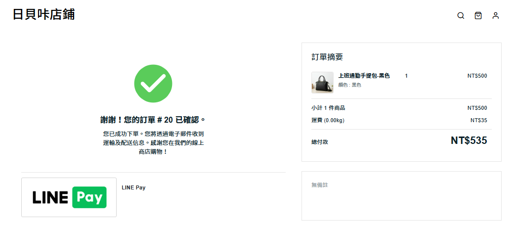 步驟四:付款成功后導回官網頁面,則表示您已成功串接了 LINE Pay