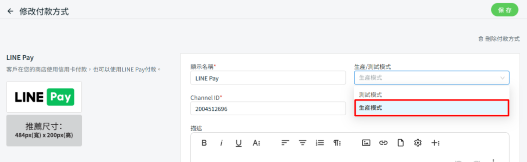 步驟五:測試完畢後,回到系統後台 設定 > 金流 > LINE Pay 轉換成 生產模式